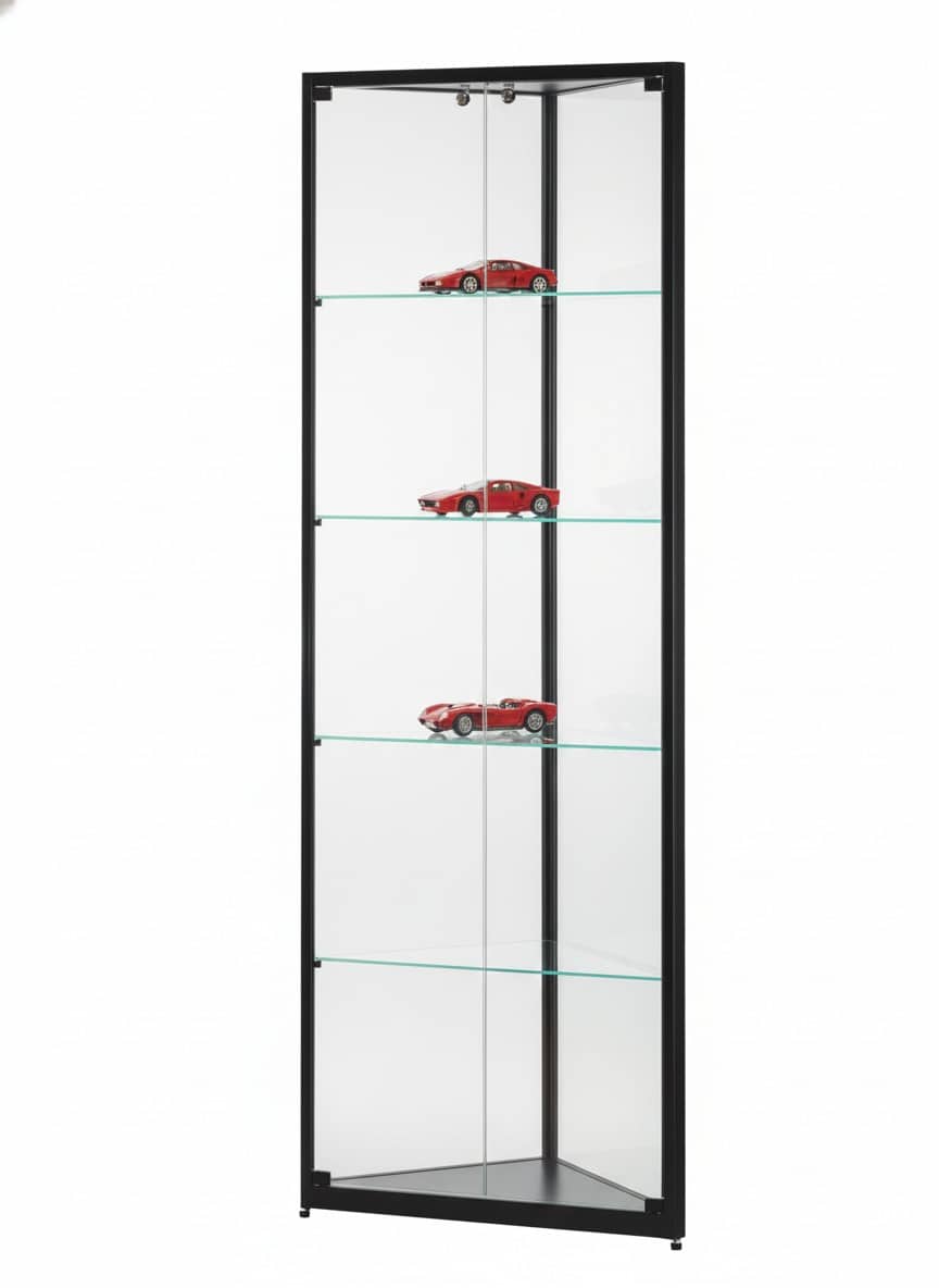 Deze hoekvitrine is uitgerust met twee draaideuren met slot en gehard veiligheidsglas aan alle zijden – voor extra zekerheid én een luxe uitstraling