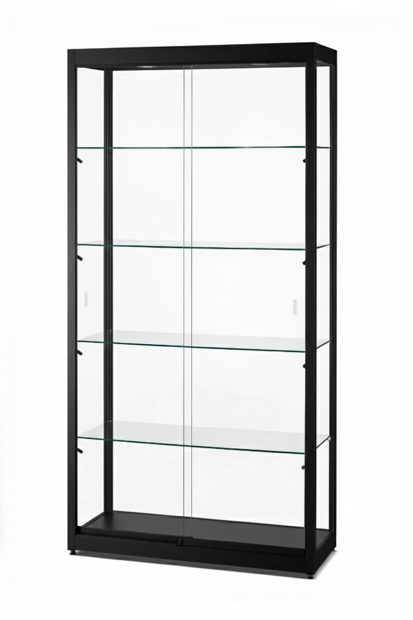 Deze vitrine is voorzien van één LED-plafondspot en een LED-rail met zwarte LED-spots (warmwit 2700 K) voor een gelijkmatige verlichting. De twee schuifruiten met ingeslepen handgreepjes en slot lopen soepel over een kogelgelagerde rail, wat zorgt voor comfortabel en veilig gebruik. De vitrine is rondom uitgevoerd in gehard veiligheidsglas, voor extra zekerheid en een luxe uitstraling.