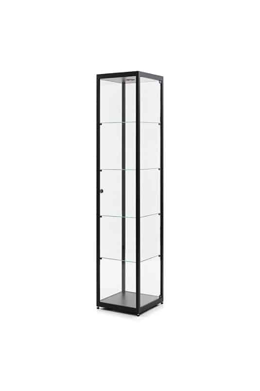 Deze vitrine is uitgerust met een draaideur met slot en gehard veiligheidsglas aan alle zijden – voor extra zekerheid en een luxe uitstraling.