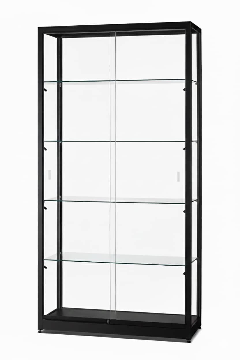 Deze vitrinekast is uitgevoerd met twee soepel schuivende glazen deuren met slot en rondom gehard veiligheidsglas.